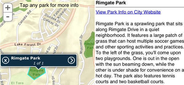 Lake Forest is home to many beautiful parks that provide wonderful opportunities to enjoy the outdoors, sports, and other community activities. The Parks map allows users to search for parks near an address or their current location (mobile version). Parks are displayed in both list and map views and users can drill down into detailed information. Parks can be filtered by amenities (picnic areas, baseball, basketball, etc.) and users can also locate parks that are hosting children’s activities.